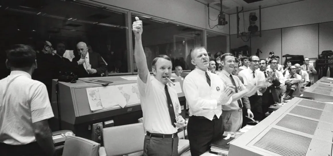 NASA 飞行主管为阿波罗 13 号安全返回鼓掌,照片由 Heritage Space/Heritage Images 通过 Getty Images 提供。