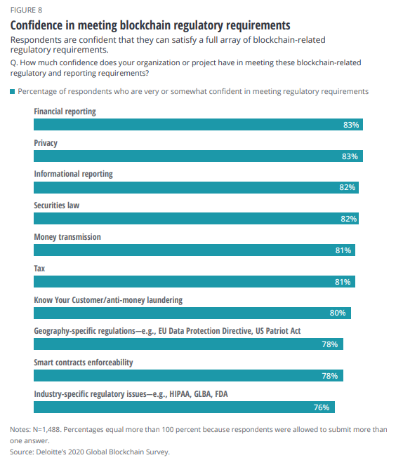 我们可以看到,在应对财报、隐私、信息披露、证券法、汇款、纳税、KYC/反洗钱、特定地理法规(如欧盟数据保护指令,美国爱国者法案)、智能合约可执行性以及行业特定监管问题等监管要求时,受访者的信心均较高。