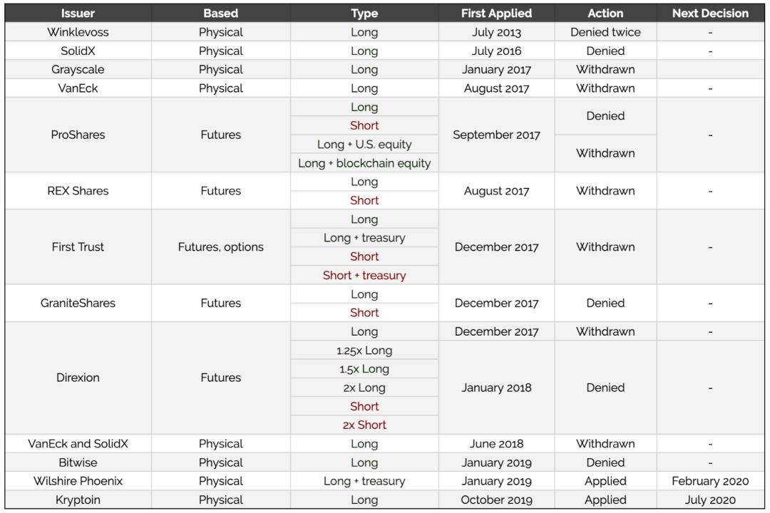 据The Block统计,截至今年1月份,一共有26支比特币EFT的申请,而其中12支已经被SEC否决,其余的则被发行者自己申请撤回。