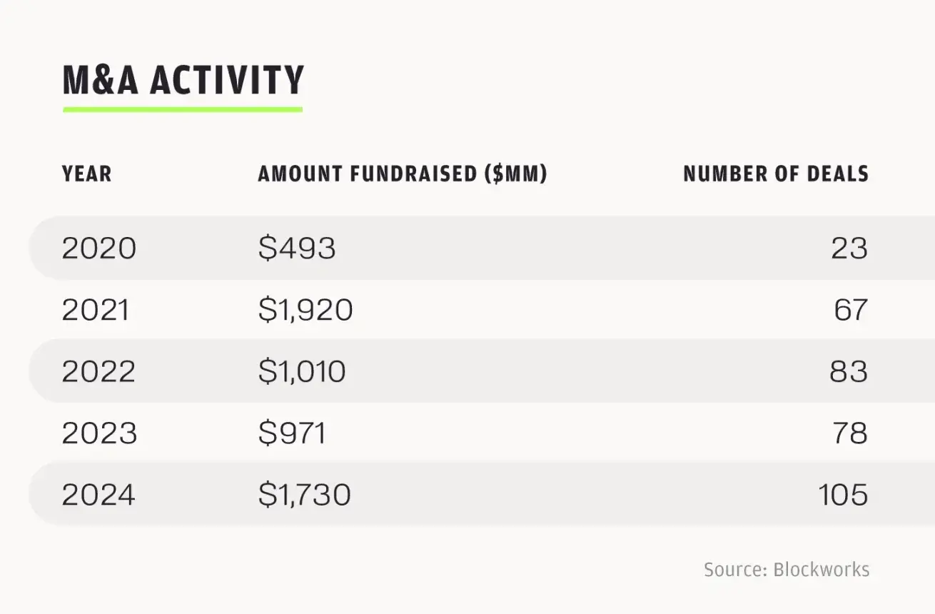 · 今年年初至今,加密货币公司已融资超 160 亿美元,并购交易超 100 笔。目前行业正朝着创纪录的方向迈进,交易总额已超过 2024 年全年水平。